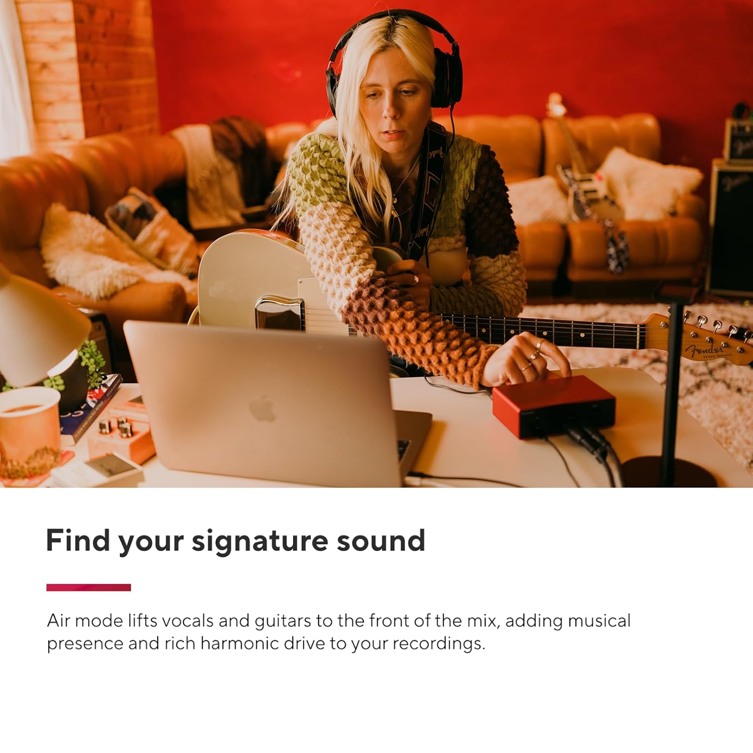 Scarlett Solo Studio is everything you need to make your first hit record, right now. Connect the CM25 MkIII studio condenser mic to Solo’s detailed, ultra-low-noise mic pre and it sounds great right away. Plug a guitar into the Hi-Z instrument input, it feels just like an amp. Then listen in stunning clarity with the SH-450 headphones.