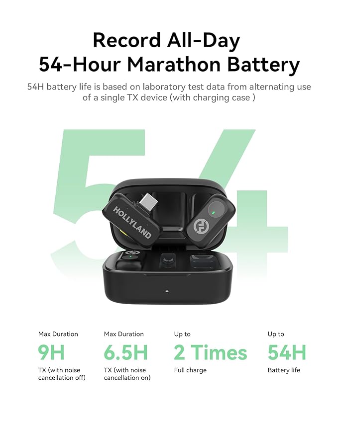 • 【Up to 54h Battery Life】Achieve up to 54h using 2 transmitter (TX) alternately with the charging case. Create endlessly without battery anxiety