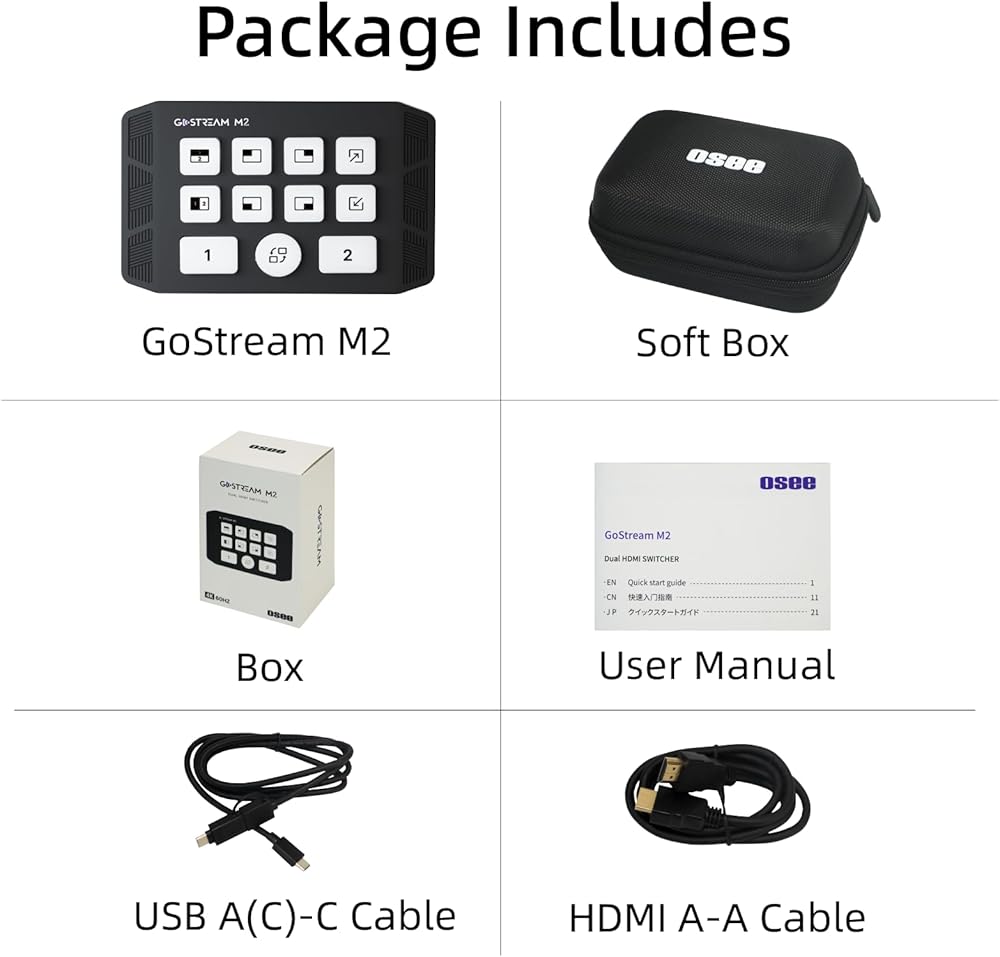 - 【Package Includes & Osee Customer Service】 Osee GoStream M2 package will include: 1xcapture card, 1xsoft box, 1xUSB A(C)-C cable, 1x HDMI cable, 1xUser manual, 1xbox. There will be Osee professional multilingual customer service team to solve any after-sales problems, please be free to contact us if any question.